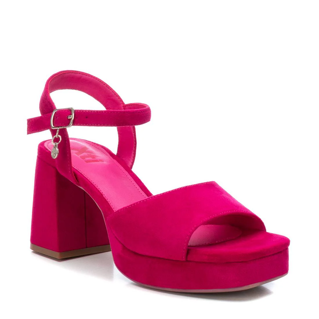 Sandalia de mujer, de la marca Xti. Fabricada en dos acabados: material que imita la piel con acabado metalizado y antelina para los colores mate. Pulsera al tobillo con hebilla regulable. Tacón ancho de 7cm con plataforma delantera forrado en el mismo material y suela antideslizante. Este modelo ha obtenido el certificado vegano por la organización mundial PETA (Organización de los derechos de los animales).